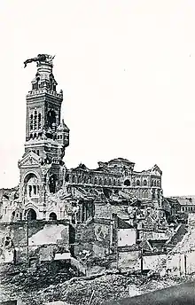 1915, View of the ruins of the Basilica of Notre-Dame de Brebières in Albert