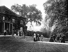 Originally, there was a path running up to the front steps, with an oval drive around the front lawn. The house stood on raised ground with terraces, as it does today. Around it was a mix of open spaces, stands of trees and flower gardens. Behind the house were vegetable and fruit gardens and, farther north, an orchard. The front lawn of The Grange, now known as the Grange Park, was central to Grange activities. This was the site for many garden parties, church school picnics and even a royal visit.