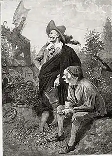 The Devil returns with a bag of gold which he pours into the boot - but it falls through the sole into a hole in the ground. The soldier chides the Devil for his meanness, and the Devil is forced to fetch more gold, but again, he fails to fill the boot. Just as the Devil is about to snatch the boot from the hand of the soldier the light of dawn breaks and the Devil flees with loud shrieks. The poor man and the soldier having saved the soul of the rich man discuss how best to divide the gold. The soldier says that his share is to be given to the poor, and he goes with the poor man to his cottage to live out his days.[3][4][5]