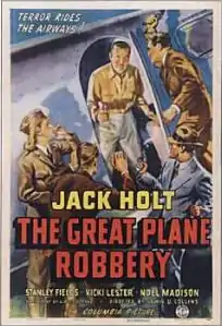 The Great Plane Robbery (aka The Great Plane Robber) is a 1940 crime-adventure B film directed by Lewis D. Collins. Collins was more often associated with directing serials for Universal and Columbia Pictures.[1] It stars Jack Holt, Stanley Fields and Noel Madison. Though typical of the melodramas that Holt made after transitioning from silent screen epics, western and adventure films were his forte. Reviewer Hal Erickson found it ironic that Holt, who in real life had a fear of flying, starred in so many aviation-oriented films.[2] It was written by Albert DeMond from a story by Harold Greene.[3]