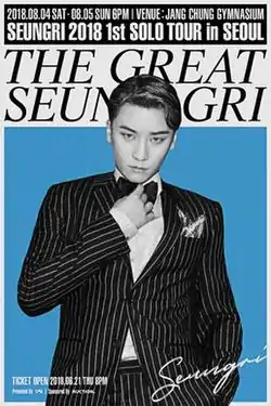 In June, the dates for South Korea shows were announced, marking it as his first shows since debuting 12 years ago. The concert series was announced as The Great Seungri and will begin at the Jangchung Gymnasium in Seoul on August 4 and 5.[6][7] 8,800 tickets were sold-out on the first two shows in Seoul, and due to tickets demands, the tour was expanded in South Korea, to include Daegu and Busan.[8][9]