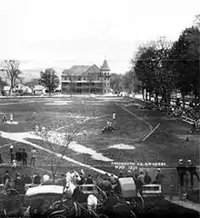 In 1824, a Hanover ordinance permitted "the playing at ball or any game in which ball is used on the public common in front of Dartmouth College," confirming the Green's ongoing use as an athletic field.[11] Cricket was among the games regularly played on the Green in the 18th century, and old division football was played by the 1820s. Dartmouth's first intercollegiate matches in baseball (1866), track and field (1875), football (1881), and tennis (1884) took place there.[2] The College built its first gymnasium (Bissell Gymnasium) on the southeast corner of the Green in 1866-67.[16]