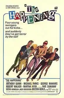The Happening is a 1967 American crime comedy film directed by Elliot Silverstein, and starring Anthony Quinn, Michael Parks, George Maharis, Robert Walker Jr., Martha Hyer, and Faye Dunaway in her film debut. It tells the story of four hippies, who kidnap a retired Mafia mob boss, holding him for ransom.