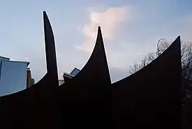 The sculpture consists of three serpentine sheets of steel standing 94 feet long and 15 feet high, each comprising two identical conical/elliptical sections, inverted relative to each other overall. The steel plates are 2 inches thick and the piece, as often in Serra's work, adapts itself to its environment.[1] It is closely related to other outdoor installations such as the double ribbons of Sidewinder (1999), on the lawn adjacent to the curving drives at Leonard Riggio’s home in Bridgehampton, New York,[2] and the single ribbon following the contour line of “Contour 290” (Glenstone, 2004).[3] An earlier example is the larger but structurally similar Snake (1996) at the Guggenheim Museum Bilbao[4] and the Double Torqued Ellipse of 1997.[5] However, although the ribbon sculptures relate to Serra's Torqued Ellipse series of this period, their openness also contrasts with the small private spaces carved out of the large public sites where the sculptures of that series are installed.[6]