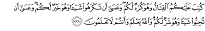 كُتِبَ عَلَيْكُمُ ٱلْقِتَالُ وَهُوَ كُرْهٌ لَّكُمْ ۖ وَعَسَىٰٓ أَن تَكْرَهُوا۟ شَيْـًٔا وَهُوَ خَيْرٌ لَّكُمْ ۖ وَعَسَىٰٓ أَن تُحِبُّوا۟ شَيْـًٔا وَهُوَ شَرٌّ لَّكُمْ ۗ وَٱللَّهُ يَعْلَمُ وَأَنتُمْ لَا تَعْلَمُونَ