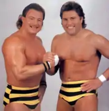 The team debuted on June 17, 1985, defeating the team of Steve Lombardi and Dave Barbie.[6] This was also Brunzell's first match in the WWF. After facing several teams, the Killer Bees started a long-running feud with the Hart Foundation (Bret Hart and Jim Neidhart). The Bees also had a running feud with the Funks (Hoss, Terry and Jimmy Jack). In August 1986, they faced Hoss and Jimmy Jack Funk in front of 70,000 people at The Big Event in Toronto,[1] a card headlined by Hulk Hogan vs. Paul Orndorff. The team also received a couple of unsuccessful shots at WWF tag team champions the Dream Team.[6][7]
