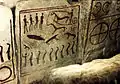 One of ten slabs of stone shows a horse drawn chariot with two four-spoked wheels