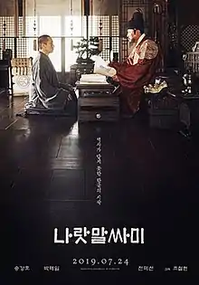 The King's Letters (Korean: 나랏말싸미, RR: Naranmalssami; Middle Korean: 나랏말ᄊᆞ미, Yale: Nalasmalssomi; lit. Language of the Country) is a Korean historical drama film released on 24 July 2019. Set in the early Joseon Dynasty, it depicts Sejong the Great and Shinmi as main characters in creating Hangul.[1] The film was directed by Jo Chul-hyun, and stars Song Kang-ho, Park Hae-il, Jeon Mi-seon, Choi Deok-moon, and Jung Hae-kyun. It grossed US$6,454,970 worldwide.[2]