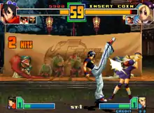 In 2000, SNK went bankrupt but Eolith contracted a license agreement in the same year to keep with the production of the series KOF. Eolith took interest into developing The King of Fighters due to the franchise's popularity in Korea and wanted to please the fans of the series worldwide. Brezza Soft helped Eolith in the making of the video game. Fearing disappointment from returning fans, Eolith decided to maintain the most of the common parts from The King of Fighters while adding new elements to it. One of the biggest changes is the optional use of Strikers where players can use between one and three characters assisting the playable one. The team aimed for a refinement of the original gameplay system from previous KOF games. While performing a popularity poll based on the characters, Eolith still aimed to make the least popular teams featured in the game. The high popularity of Kyo Kusanagi and Iori Yagami led to their immediate inclusion in the game.[1] Despite being created by Eolith, the Mexican company Evoga had a major influence in the game due to the franchise's popularity within Latin America. This to creating setting with Mexican traits and most notably Ángel, a NESTS agent from the country.[2] References to works from Evoga can be seen in the scenarios from the game. While working on it, the team played The King of Fighters '98 alongside the developers to see if they could include a character within the game. A member from Evoga won, resulting in the team requesting to add Ángel in the game.[3]