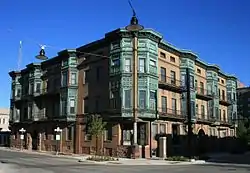 The Kirk is a historic building located in Mason City, Iowa, United States. Completed in 1903, this was the city's first luxury apartment building.[2] Horace P Kirk, who owned and managed the building, was a Mason City businessman, photographer, and civic leader. He built two other buildings here and to the north that were destroyed in a fire in 1902. This building was built on the site of Kirkland Flats, and parts of its stone foundation and north wall may be from the H.P. Kirk wholesale building that had been built in 1892.[2] Originally The Kirk supplied heat, light, and water for the apartments with its own steam generating plant. It has subsequently acquired city utilities. The building features an eclectic design that is organized into horizontal and vertical elements. The horizontal is realized in wide brick bands on the floors. The vertical is realized in the copper-clad oriel windows that tie the second and third floors to the cornice. The building was individually listed on the National Register of Historic Places in 1982,[1] and as a contributing property in the Mason City Downtown Historic District in 2005.[3]
