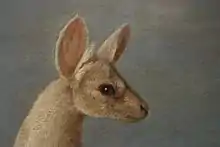The Kongouro from New Holland is an oil painting by George Stubbs. Depicting a kangaroo, it is the first painting of an Australian animal in Western Art, along with a painting of a dingo—Portrait of a Large Dog—also by George Stubbs. It is part of the collection of the National Maritime Museum in Greenwich, London.[1] The work was commissioned by Joseph Banks and based on the inflated skin of an animal he had collected from the east coast of Australia in 1770 during Lieutenant James Cook's first voyage of discovery.[2] It also seems to be based on Sydney Parkinson's drawing of a kangaroo; Parkinson was Joseph Banks's botanical illustrator on the first voyage of James Cook. It depicts the animal sitting on a rock and looking over its shoulder with a backdrop of trees and mountains. The two were the only two paintings that Stubbs did not draw from a live subject.[2]