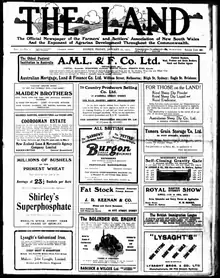 The Land first appeared in 1911 as a two penny broadsheet. It was originally published by the Farmers and Settlers' Association of New South Wales[1] and later Rural Press, which merged with Fairfax Media.[2]