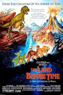 During production of An American Tail, talk began of the next feature with Bluth and executive producer Steven Spielberg. Bluth and Spielberg wanted to do a film similar to Bambi, but with dinosaurs. Steven Spielberg's longtime friend George Lucas was also brought in on the project after being interested with it. The three persuaded An American Tail writers Judy Freudberg and Tony Geiss to write the screenplay for the film. Their initial draft was based on their early ideas, but when it was felt the story was too juvenile, Stu Krieger was brought on to revise their draft.[10] Early into story development, the film was about a group of young dinosaurs looking for a wise, older dinosaur.[11] Later on, Bluth explained, "...we came up with another idea that none of these dinosaurs get along with each other, they all hate each other. They're taught from the time they were born not to associate with each other, that's racism."[10] An early working title for the film was The Land Before Time Began.[12] Bluth, Spielberg and Lucas originally wanted the film to have no dialogue, like The Rite of Spring sequence in Fantasia, but the idea was abandoned in favor of using voice actors in order to make it appealing to children.[10]