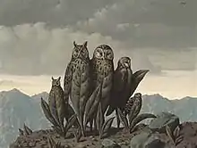 Magritte's 1942 painting, Les compagnons de la peur ("The Companions of Fear"), bears the title given to The League of Frightened Men when it was published in France in 1939 by Gallimard. It is one of Magritte's series of "leaf-bird" paintings. Created during the Nazi occupation of Brussels, it depicts a stormy, mountainous landscape in which a cluster of plants has metamorphosed into a group of vigilant owls.[10]