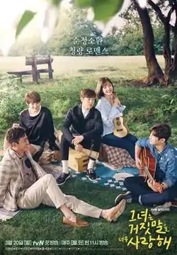 The Liar and His Lover (Korean: 그녀는 거짓말을 너무 사랑해; RR: Geunyeoneun Geojitmaleul Neomu Saranghae; lit. She Loves Lies Too Much) is a South Korean television series starring Lee Hyun-woo and Joy (Park Soo-young) with Lee Jung-jin, Lee Seo-won and Hong Seo-young. The drama is based on the popular Japanese manga Kanojo wa Uso o Aishisugiteru by Kotomi Aoki.[1] It aired on tvN every Monday and Tuesday at 23:00 (KST) starting from March 20, 2017.[2][3][4][5][6][7] The series was also released internationally on Netflix starting from October 1, 2019.