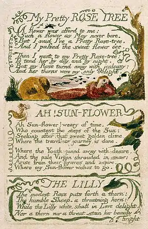 According to Antal, Blake's Flower Plate is composed of three flower poems on the same plate for a reason: to illustrate three types of love; Poetic Love, Earthly Love, and Human Love. The Lilly deals with the "Poetic Love" concept of this "threefold vision of love".[3] This is considered the "Poetic Love" because the Lilly is innocent, and pure, and unable to be besmirched by love or by thorns. As Johnson states, "Oddly enough, most emblem designs featuring lilies show the flower surrounded by thorns."[4] Blake's Lilly has no thorns. Unlike the sheep or the Rose, the Lilly is the purest of them all. This echoes poetic love as ideally, love should be flawless. Love should be perfect and everything that people dream of. Even though the two lovers themselves may have flaws, love itself shouldn't have any.
