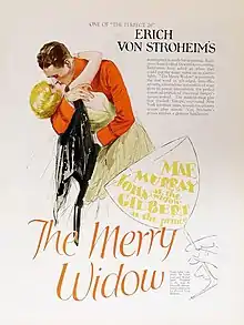 The Merry Widow is a 1925 American silent romantic drama/black comedy film directed and written by Erich von Stroheim. Released by Metro-Goldwyn-Mayer, the film stars Mae Murray, John Gilbert, Roy D'Arcy, and Tully Marshall,[2][3] with pre-fame uncredited appearances by Joan Crawford and Clark Gable.