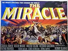 The Miracle is a 1959 film directed by Irving Rapper and starring Carroll Baker and Roger Moore. It is a remake of the 1912 hand-colored, black-and-white film The Miracle, which was in turn a production of the 1911 pantomime play, The Miracle, written by Karl Vollmöller and directed by Max Reinhardt.
