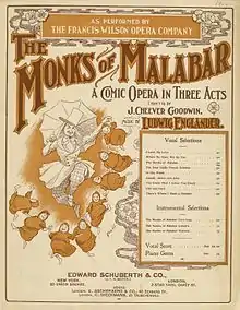The Monks of Malabar is a "comic opera" or operetta in 3 acts composed by Ludwig Englander with lyrics by J. Cheever Goodwin and book by Francis Wilson (uncredited) and Goodwin. It opened at the Knickerbocker Theatre on 13 September 1900 and closed on 20 October after 39 performances.[1] For its Broadway production, the scenery was designed by Henry E. Hoyt, costumes were designed by Henry Dazian (costumes worn by Miss Lessing furnished by B. Altman and Company), shoes furnished by Cammeyer. The music director and conductor was Emerico Morealle.