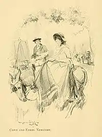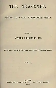 The Newcomes was published serially over about two years, as Thackeray himself says in one of the novel's final chapters. The novel shows its serial origin: it is very long (an undated but clearly very old edition with tiny type fills 551 pages) and its events occur over many years and in several countries before the reader reaches the predictable conclusion. The main part of The Newcomes is set a decade or two after the action of Vanity Fair, and some of the characters in Vanity Fair are mentioned peripherally in The Newcomes. The narrator is Arthur Pendennis, the protagonist of Pendennis. It was illustrated by Richard Doyle, both in literal renderings of the scenes and in symbolic and fanciful depictions of events and characters.[1]