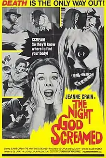 The Night God Screamed is a 1971 American psychological thriller film, also classified as a horror film, independently made on a low budget by Lasky/Carlin Productions (producers Ed Carlin and Gil Lasky, with Lasky writing the screenplay). Due to the sensitivities connected with displaying such a provocative title, theater owners in small town and rural communities were offered the option of using the short alternative appellation, Scream.