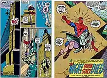 The Green Goblin abducts Peter's girlfriend, Gwen Stacy, and lures Spider-Man to a tower of either the Brooklyn Bridge (as depicted in the art) or the George Washington Bridge (as given in the text).[1][2] The Goblin and Spider-Man clash, and the Goblin hurls Stacy off the bridge. Spider-Man shoots a web strand at her legs and catches her. As he pulls her up, he thinks he has saved her, however he quickly realizes she is dead. Unsure whether her neck was broken by the whiplash from her sudden stop or had been already broken by the Goblin prior to her fall, he blames himself for her death. A note on the letters page of The Amazing Spider-Man #125 states: "It saddens us to say that the whiplash effect she underwent when Spidey's webbing stopped her so suddenly was, in fact, what killed her.", although later issues would reveal Gwen died from the fall itself.[1]