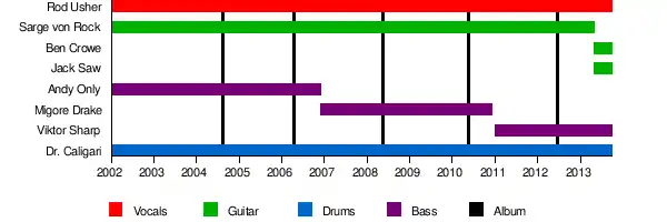 - Dr. Caligari – drums (2002–present) (refers The Cabinet of Dr. Caligari (1922), a German expressionist film directed by Robert Wiene)