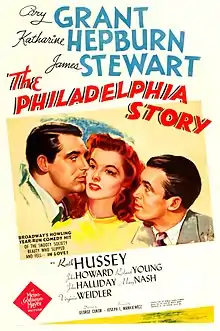 The Philadelphia Story is a 1940 American romantic comedy film[2][3] directed by George Cukor, starring Cary Grant, Katharine Hepburn, James Stewart, and Ruth Hussey. Based on the 1939 Broadway play of the same name by Philip Barry,[4] the film is about a socialite whose wedding plans are complicated by the simultaneous arrival of her ex-husband and a tabloid magazine journalist. The socialite character of the play—performed by Hepburn in the film—was inspired by Helen Hope Montgomery Scott (1904–1995), a Philadelphia socialite known for her hijinks, who married a friend of playwright Barry.[5]