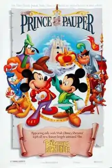 The Prince and the Pauper is a 1990 American animated comedy action-adventure featurette produced by Walt Disney Feature Animation and directed by George Scribner. Featuring the voice of Wayne Allwine as Mickey Mouse, it is inspired by Mark Twain's 1881 novel of the same name. It was Disney's final use of the traditional ink-and-paint and camera process,[1] before the CAPS digital-ink-and-paint process rendered the traditional techniques and equipment obsolete.[2] Some objects, such as the carriage, were created on computers before being printed out on paper and photocopied onto animation cels.[3]