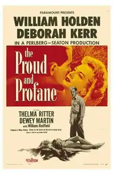 The Proud and Profane is a 1956 dramatic war romance made by William Perlberg-George Seaton Productions for Paramount Pictures. It was directed by George Seaton and produced by William Perlberg, from a screenplay by George Seaton, based on the 1953 novel The Magnificent Bastards by Lucy Herndon Crockett.[2] The film stars William Holden and Deborah Kerr with Thelma Ritter, Dewey Martin, William Redfield and Peter Hansen in supporting roles.[3]