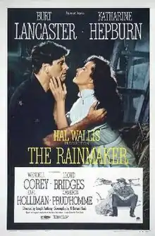 The Rainmaker is a 1956 American romance film directed by Joseph Anthony and adapted by N. Richard Nash from his 1954 play The Rainmaker. The film tells the story of a middle-aged woman, suffering from unrequited love for the local town sheriff; however, she falls for a con man who comes to town with the promise that he can make it rain. It stars Burt Lancaster, Katharine Hepburn, Wendell Corey, Lloyd Bridges and Earl Holliman. Holliman won a Golden Globe Award for his performance.