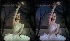 A main point of contention amongst both British and American critics was a perceived lack of realism in respect to the ballet sequences.[54] The focus of this criticism was the film's central 17-minute ballet performance of The Ballet of the Red Shoes: Many dance critics felt the sequence's impressionistic touches—which include abstract hallucinations and visual manifestations of Vicky's mental state—detracted from the physical aspects of the ballet.[55] British ballet critic Katherine Sorley Walker also dismissed the sequence, commenting that it marked "a departure from the illusion of stage ballet to the limitless and lush spaces reflecting the ballerina's thought."[52] Eames made similar criticism, condemning the subjective elements of the sequence as "corrupting the integrity of the ballet," as well as the choreography.[56] Philip K. Scheuer of the Los Angeles Times, however, praised the presentation of ballet in the film, deeming it "the most ambitious—and probably the most dazzlingly successful—use of traditional-type ballet in any motion picture to date."[57]