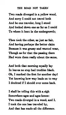 "The Road Not Taken" is a narrative poem by Robert Frost, first published in the August 1915 issue of The Atlantic Monthly,[1] and later published as the first poem in the collection Mountain Interval (1916). Its central theme is the divergence of paths, both literally and figuratively, although its interpretation is noted for being complex and potentially divergent.