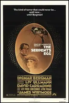 The Serpent's Egg is a 1977 American-West German drama film written and directed by Ingmar Bergman and starring David Carradine and Liv Ullmann. The story is set in 1920s Berlin and features English and German dialogue. It was Bergman's only Hollywood film. The title is taken from a line spoken by Brutus in Shakespeare's Julius Caesar: "And therefore think him as a serpent's egg / Which hatch'd, would as his kind grow mischievous; / And kill him in the shell". Even though the film was a critical and commercial failure upon its initial release, Bergman was reported to be happy with the film.[2]