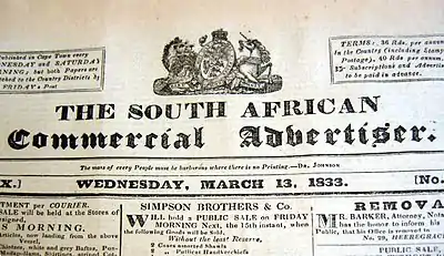 The South African Commercial Advertiser was South Africa's first independent newspaper and started publication in Cape Town on 7 January 1824. It was banned between 5 May 1824 and 31 August 1825, and between 10 March 1827 and 3 October 1828, by order of the Governor at the Cape, Lord Charles Somerset.