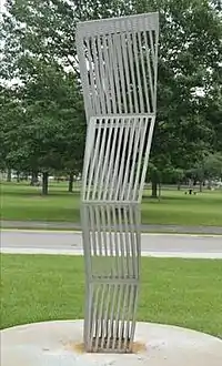 The South Tower is an abstract, frosted stainless steel aluminum rectangular sculpture.[4] Measuring 10 ft x 3 ft x 2 ft, the structure is vertically-louvered and is depicted as coming apart at the top.[3] The grate-like design of each section is carried through the sculpture creating a leaning, S-shaped structure.[5] Each section is composed of 11 straight bars of aluminum. Four bolts secure the artwork to the circular concrete base.[6] It is signed "Don Gummer 2008" on the front of the artwork, at the top of the bottom element.