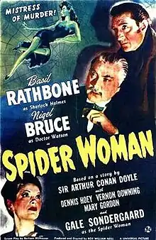 The Spider Woman (alternatively titled Sherlock Holmes and the Spider Woman and Spider Woman) is a 1943 mystery film starring Basil Rathbone as Sherlock Holmes and Nigel Bruce as Dr. Watson, the seventh of fourteen such films the pair were involved in. As with all of the Universal Studios films in the series, the film is set in then-present day as opposed to the Victorian setting of the original stories. This film incorporates elements from the 1890 novel The Sign of the Four, as well as the short stories "The Final Problem", "The Adventure of the Empty House", "The Adventure of the Speckled Band" and makes explicit reference to "The Adventure of the Devil's Foot".[1]