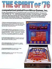 The Spirit of '76 was the first microprocessor-based pinball table. It was released by Mirco Games, Inc. in July 4 1975. The pinball machine should not be confused with the pinball machine Spirit of 76 by Gottlieb.[1][2]