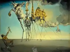 Artists and authors have long represented the temptation of St. Anthony in their art. The Temptation of St. Anthony is painted with oil on canvas. It depicts a desert-like landscape: a low horizon line with high clouds and dark, warm tones in an azure sky. The figure of St. Anthony kneels in the bottom left corner. He holds up a cross in his right hand and with his left hand supports himself on an ambiguous form. A human skull lies by his right foot. A parade of elephants led by a horse approach St. Anthony. The elephants carry symbolic objects representing temptation: a statue of a nude woman holding her breasts, an obelisk, a building complex confining a nude, disembodied female torso, and a vertical tower. The animals have exaggerated, long, spindly legs, making them appear weightless.