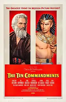 The Ten Commandments is a 1956 American epic religious drama film produced, directed, and narrated by Cecil B. DeMille,[5] shot in VistaVision (color by Technicolor), and released by Paramount Pictures. Based on the 1949 novel Prince of Egypt by Dorothy Clarke Wilson,[6] the 1859 novel Pillar of Fire by J. H. Ingraham,[7] the 1937 novel On Eagle's Wings by A. E. Southon,[8] and the Book of Exodus, The Ten Commandments dramatizes the biblical story of the life of Moses, an adopted Egyptian prince who becomes the deliverer of his real brethren, the enslaved Hebrews, and thereafter leads the Exodus to Mount Sinai, where he receives, from God, the Ten Commandments. The film stars Charlton Heston in the lead role, Yul Brynner as Rameses, Anne Baxter as Nefretiri, Edward G. Robinson as Dathan, Yvonne De Carlo as Sephora, Debra Paget as Lilia, and John Derek as Joshua; and features Sir Cedric Hardwicke as Seti I, Nina Foch as Bithiah, Martha Scott as Yochabel, Judith Anderson as Memnet, and Vincent Price as Baka, among others.[5]