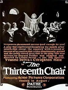 The Thirteenth Chair is a 1919 American silent mystery film directed by Léonce Perret and starring Yvonne Delva, Creighton Hale and Marie Shotwell.[1] It was based on a play of the same name by Bayard Veiller. Subsequent film adaptations were made in 1929 as The Thirteenth Chair and 1937 again under the same title.