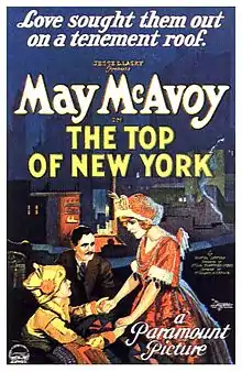 The Top of New York is a lost 1922 American silent drama film directed by William Desmond Taylor and written by George James Hopkins, Julia Crawford Ivers and Sonya Levien.[1] The film stars May McAvoy, Walter McGrail, Pat Moore, Edward Cecil, Charles Bennett, and Mary Jane Irving. The film was released on June 18, 1922, by Paramount Pictures, four months after director Taylor's murder, and was the last one he completed.[2][3]