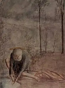 The Brancacci Chapel, in the basilica of Santa Maria del Carmine, was founded around 1366/7 by Felice Brancacci.[3] The chapel passed to Piero's nephew, Felice Brancacci, who some time between 1423 and 1425 commissioned the painter Masolino to decorate the walls with a series of frescoes from the life of Saint Peter. Peter was the name-saint of the founder, and the patron saint of the Brancacci family, but the choice also reflected support for the Roman papacy during the Great Schism.[4]