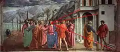 In the story, Peter is clearly singled out among the disciples, and his strong connection with Christ can be seen in Christ's words "for me and thee".[10] Peter appears a majestic and energetic figure when he is with Christ and when he performs his work, in contrast to the diminutive shape on the left. This all points forward to his apostolic role as Christ's vicar on earth.[17] As such The Tribute Money represents a transitional scene in the chapel; in doing Christ's bidding Peter goes from being a disciple to being the master.[18]