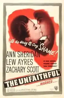 The Unfaithful is a 1947 film noir directed by Vincent Sherman and starring Ann Sheridan, Lew Ayres and Zachary Scott. The film is based on the W. Somerset Maugham-penned 1927 play and William Wyler-directed 1940 film The Letter.[4]