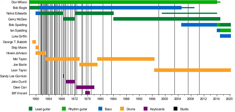 | Past members | Nokie Edwards Don Wilson Bob Bogle Gerry McGee Howie Johnson Mel Taylor John Durrill Joe Barile Dave Carr Biff Vincent Leisha Soukary Jonell Calendar George T. Babbitt, Jr. Paul Warren JD Hoag Harvey Wicklund Gary Woods |