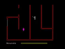 As a third-person arcade adventure game, the player takes the role of an adventurer on a quest to find the treasure of a powerful warlock, hidden deep within Firetop Mountain. The treasure is stored in a chest with fifteen locks, with the keys guarded by various monsters (e.g. orcs, slime moulds and spiders) in the dungeons of Firetop Mountain. The adventurer (equipped with a bow and a sword) must attempt to retrieve the keys, with an added feature (over the game's predecessor, Halls of the Things) being the ability to open and close doors to block the path of pursuing monsters. Gameplay varies with each new game as the maze is randomly generated.[1]