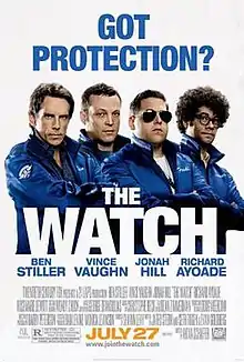 The Watch (previously known as Neighborhood Watch)[3] is a 2012 American science fiction comedy film directed by Akiva Schaffer and written by Jared Stern, Seth Rogen, and Evan Goldberg. It stars Ben Stiller, Vince Vaughn, Jonah Hill, and Richard Ayoade. The film follows Evan (Stiller), Bob (Vaughn), Franklin (Hill), and Jamarcus (Ayoade), a group of neighbors who form a suburban neighborhood watch group. When they uncover an alien plot threatening the world, they are forced into action. The film is the final film role of R. Lee Ermey, who died on April 15, 2018.