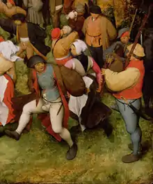 The movements of the people show that their behaviour is inappropriate or a caricature of rustic buffoonery, but its representation of fertility and reproduction is presented in a joyful manner.[18][23] Indeed, the painting reflects a degree of ambiguity in that it can both be seen as an attack on the stereotypical oversexed behaviour of the lower orders as well as evoking a comical picture.[24] In the sixteenth century, when this was painted, dance was subject to a strict code and regarded by the authorities and church as a social evil.[24] People could not swing their arms or legs or laugh too loud, as that would be considered a type of rudeness to many people.[24] The painting therefore "expresses the peasants' liberation from the stricter limits of upper classes" by failing to adhere to the expected social standards of the times.[24][25][26]