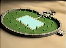 The earliest inscription found about the gardens' massive enclosure was by Mukarrib Yada`'il Dharih in the 7th century BCE.[3] The enclosure is defined by a massive oval shaped wall, measuring approximately 757 m long and 13 m high, however the original height can't be determined for certainty, and it's difficult to assess its full extent.